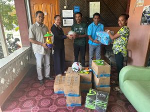 PRADET provides social contribution to community activity to establish peace and promote youth positive mentality in sub-village Efaca, Village of Manleuana through sports events in the celebration of the Popular Consultation Day on 30th August 1999. The contribution materials for the activities are Football, Uniform, Aqua etc. The materials are symbolically handed over by the representatives of PRADET’s structure members to the Sub-Villager Chief, Chief of Youth and Delegate of Sub-Village of Efaca at the PRADET office in Manleuana, Dili. The objective of the contribution is to motivate better sports activity which is planned by the youths themselves to be realized. The other objectives of the contribution and motivation from PRADET for the sports activity are to maintain good relationships between individuals and youth groups to contribute to peace and tranquillity at the sub-village and in the Village of Manleuana.